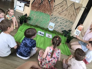 Przedszkolaki dowiedziały się jakie są charakterystyczne cechy krajobrazu w lecie , jak wyglada tęcza , kiedy możemy ją obserwować , z jakich kolorów powstaje.