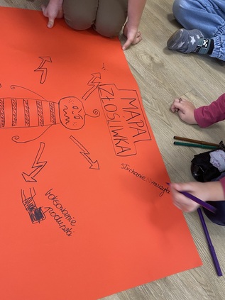 Wymyślaliśmy i wymieniamy akceptowalne społecznie sposoby odreagowywania złości. Wspólnie tworzyliśmy ,,Mapę złośliwka”. Znamy i rozpoznajemy literę U. Ćwiczyliśmy miłe i uprzejme zwracanie się do innych. A gdy jest nam smutno to wiemy, jakie są sposoby na poprawę samopoczucia używamy wyrażeń ,,mniej niż…”, ,,więcej niż…”radzimy sobie w sytuacji porażki i wygranej.