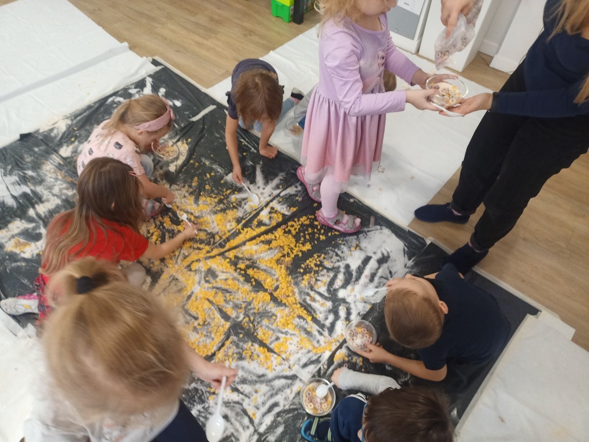 Przygotowania do Świąt w grupie Bąbelków rozpoczęły się od wizyty Pana Ciastka. Dzieci aktywnie brały udział w zajęciach integracji sensorycznej, która jest jednym z najważniejszych procesów rozwojowych. Głównym celem zabaw sensorycznych jest wsparcie rozwoju mózgu,czyli umiejętne posługiwanie się zmysłami. W związku z tym jednym z zadań przedszkolaków było rozpoznanie zapachów różnych produktów spożywczych.